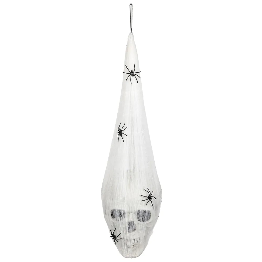 Det er okay at være skræmmende og uhyggelig til halloween, så hæng denne uhyggelige dekoration af et kranium med lysende øjne og indhyllet i spindelvæv op og skræm livet af alle. Dekorationen har en praktisk løkke, så den er nem at hænge op. Den perfekte dekoration til din halloweenfest.