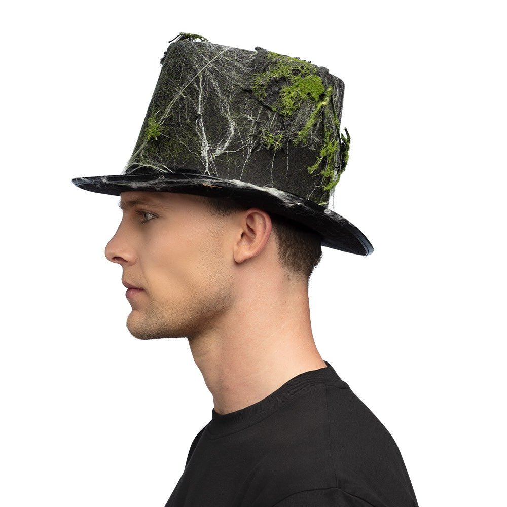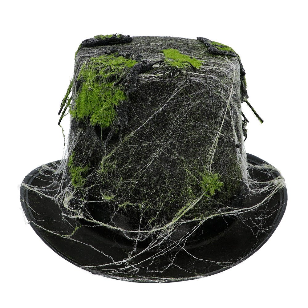 Med spindelvæv, mos og et forvitret look ser denne hat ud, som om den er hentet direkte fra en uhyggelig sump. Sammen med et mørkt zombiekostume eller et skræmmende troldmandsoutfit skaber denne høje hat det perfekte uhyggelige look. Et must til enhver halloweenfest, trick-or-treat-parade eller spøgelseshus.
