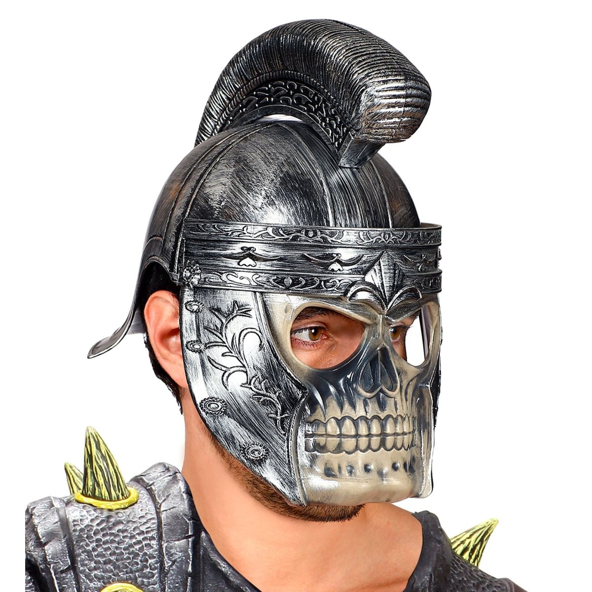 Fuldend dit uhyggelige romerske kostume med denne sølvfarvede hjelm med kraniedetaljer. Perfekt til halloween, temafester eller udklædningsfester.