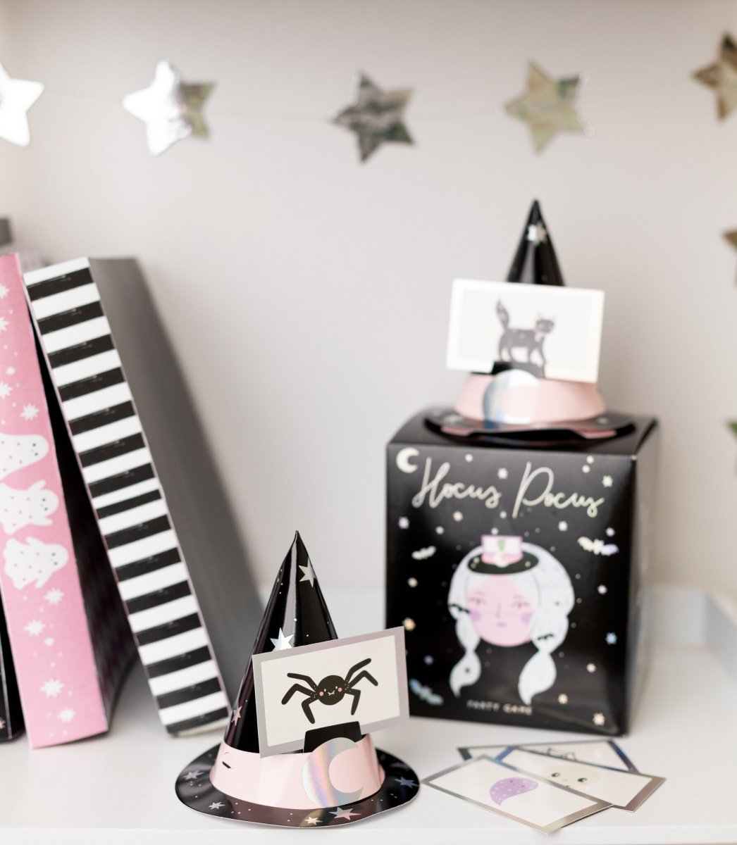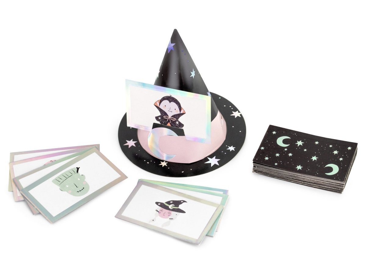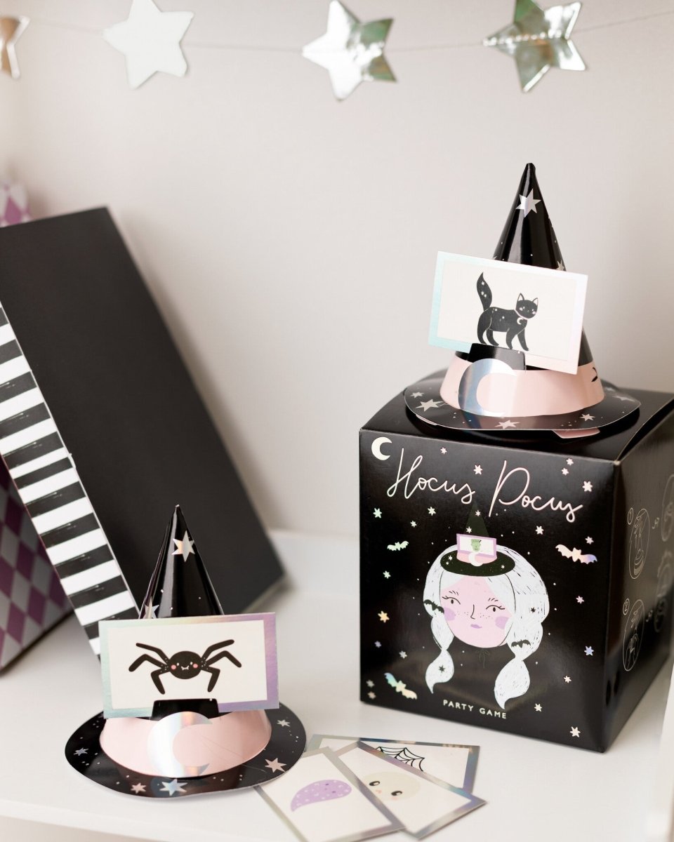 Kortspillet "Gæt hvad?" Indeholder 6 elastiske heksehatte og 40 billedkort. Antal spillere: 2 - 6.