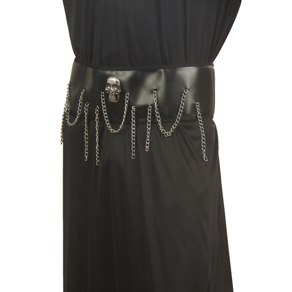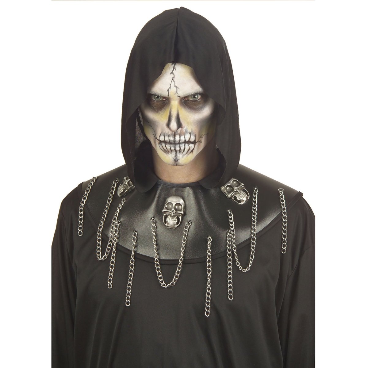 Pakkens indhold: kappe med hætte, kraniehalskæde med kæder, kraniebælte med kæder