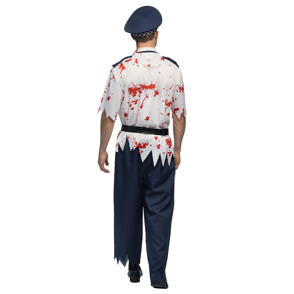 Horror er loven under Halloween, og med dette bloddryppende Halloween-kostume er du klar til at håndhæve den! Dette uhyggelige zombie-politimandskostume til mænd inkluderer blodigt politioutfit, matchende slips og politikasket og udstråler den perfekte blanding af uhygge og autoritet. Ideelt til halloweenfester, temabegivenheder eller trick-or-treat-parader, hvor du vil skræmme livet af alle.