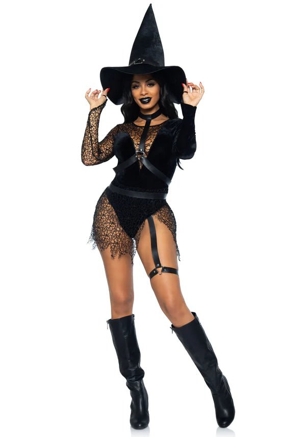 Lad din magt og charme skinne i det ultra-sexede troldkvinde-kostumesæt fra Leg Avenue! Kostumet består af en fløjlsbody med dyb V-udskæring og trykknaplukning i skridtet, suppleret med et seletøj i kunstlæder med chocker og en klassisk heksehat i fløjl. De fortryllende netlag og det forførende benbånd gør dette look uimodståeligt, perfekt til halloween eller en magisk temafest! 🖤🌙