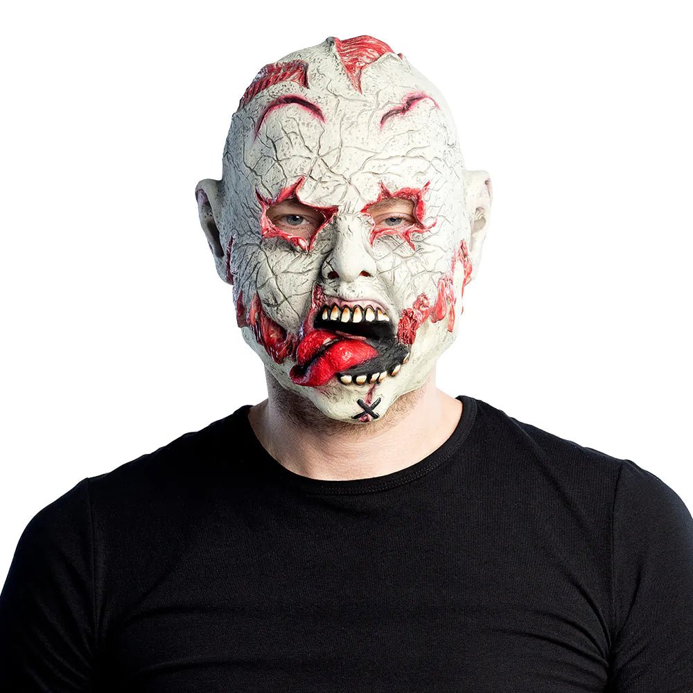 En uhyggelig zombie-latexmaske til voksne. Latex-hovedmasken ligner en levende død med sår og brækket kæbe. Så dette er bestemt en maske, der passer perfekt til halloween-temaet og er mere end velegnet til et uhyggeligt halloween-kostume.
