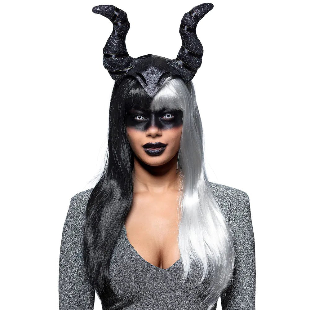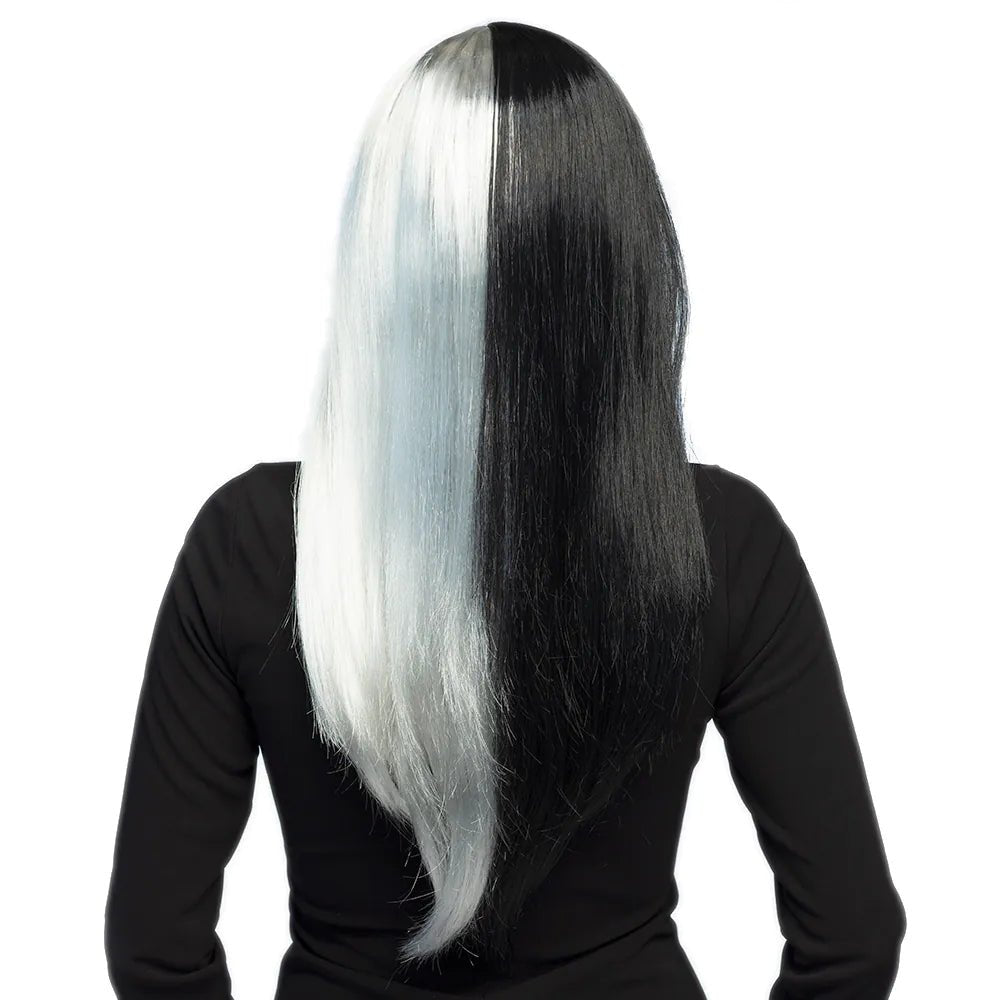 En smuk tofarvet kvindeparyk med langt glat hår og frynser. Parykken har et særligt look, idet den ene side er sort, og den anden side er hvid. Det gør parykken perfekt at bruge som tilbehør til et mørkt halloween-outfit eller et sexet cosplay- eller karnevalskostume.
