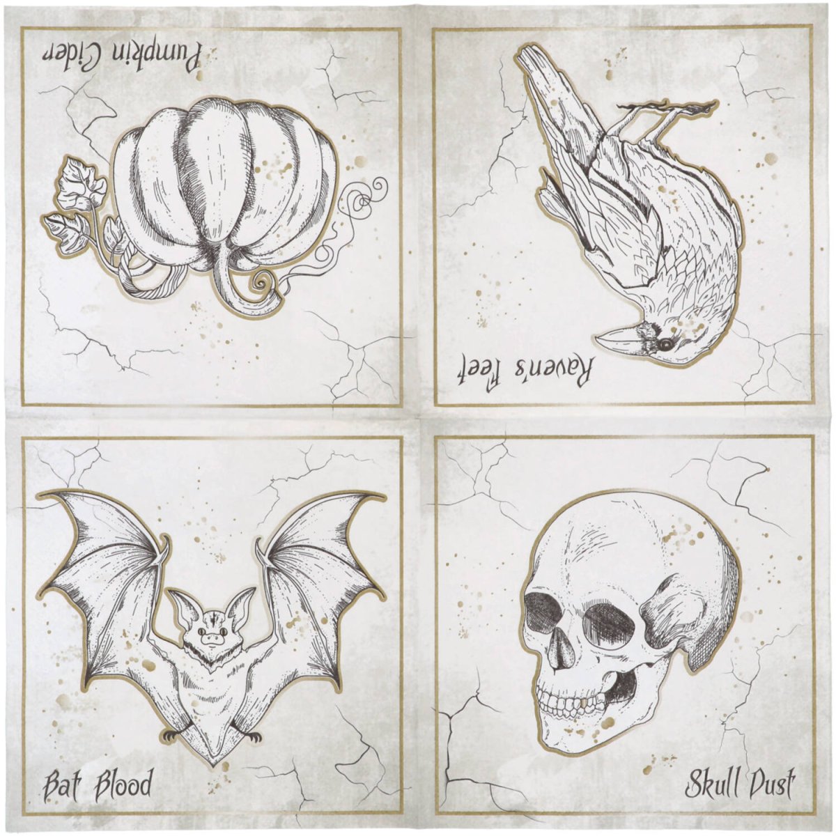 Til uhyggelige kuriositeter. Servietter - Creepy Curiosities - 33 x33 cm - 20 stk. Indhold: 20 servietter (3-lags) Kan f.eks. bruges til følgende fester/anledninger: Halloween, temafest. Lidt skræmmende og også meget smukke. Papirservietter i 4 forskellige designs: kranium med teksten "Skull Dust", flagermus med teksten "Bat blood", ravn med teksten "Raven's Feet", græskar med teksten "Pumpkin Cider". Alt sammen i en tegnet stil med smukke detaljer. Denne vare er lavet af papir.