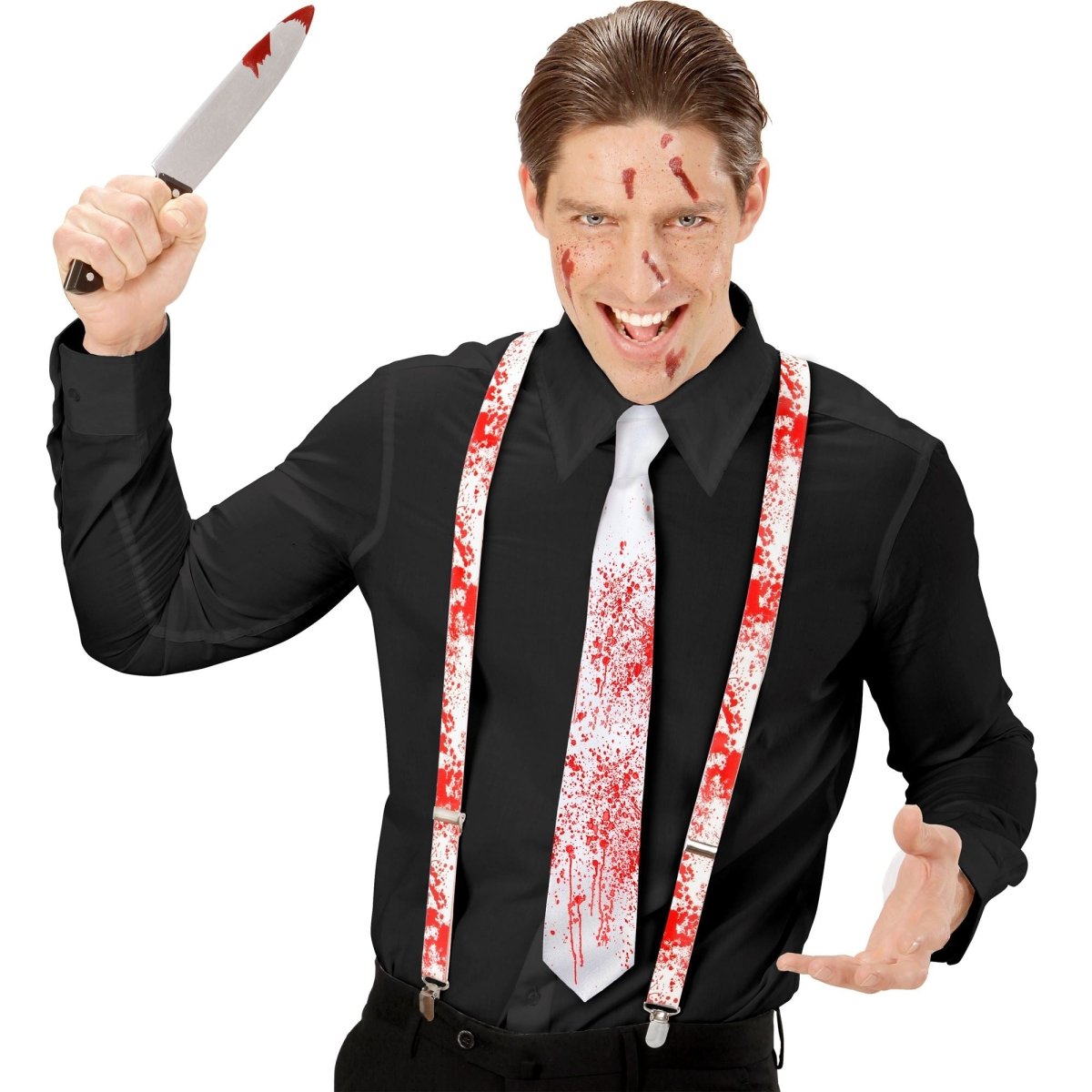 Sæt et uhyggeligt præg på dit halloween-outfit med dette blodige slips i hvid med røde detaljer. Perfekt til temafester, gyserkostumer eller som et spændende tilbehør til kostumer.