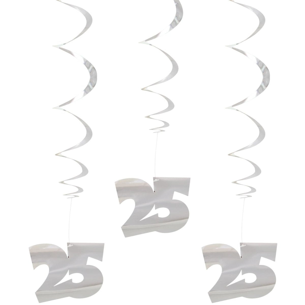 Sølv hængende dekoration 25 år - 3 stk. Indhold: 3 stk. hængende dekoration. Kan f.eks. bruges til følgende fester/anledninger: Jubilæum, fødselsdag. Artiklens længde: 75 cm. Varen er lavet af papir.