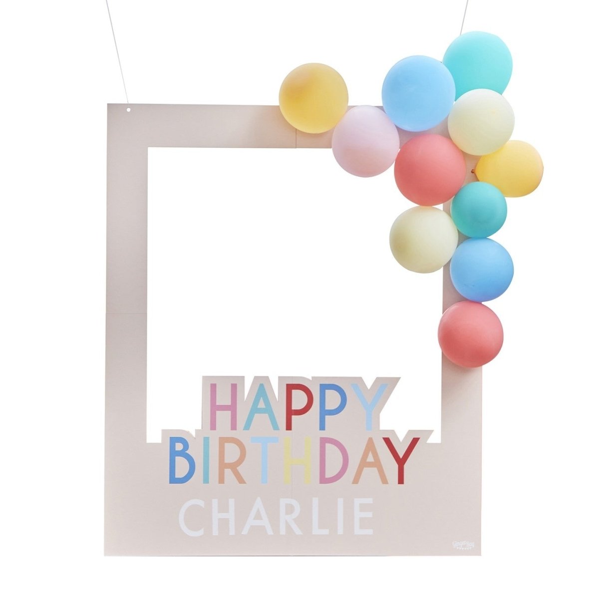 Hver pakke indeholder 1 ramme på 720 mm (H) x 600 mm (B) og 4 ark med regnbuebogstaver og 11 balloner.