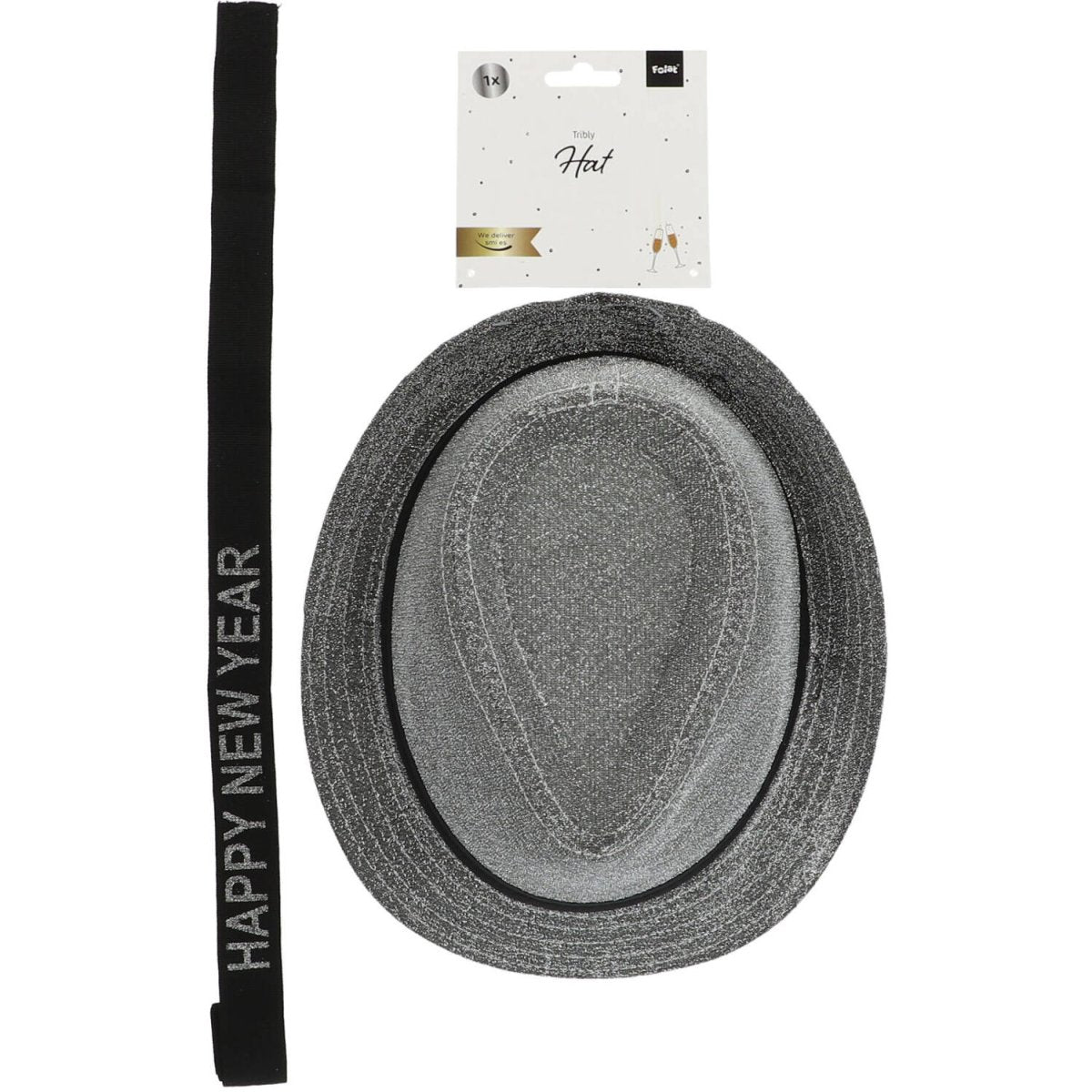Trilby Hat 'Happy New Year' Lurex Silver. Indhold: 1 hat. Farve: Sølvfarvet. Kan f.eks. bruges til følgende fester/anledninger: Gammelt & nytår og temafester. Hattens størrelse: 59 cm. Hatten har et aftageligt bånd med teksten "Happy New Year". Fjern båndet, og brug hatten til andre temafester. Varen er lavet af polyester.