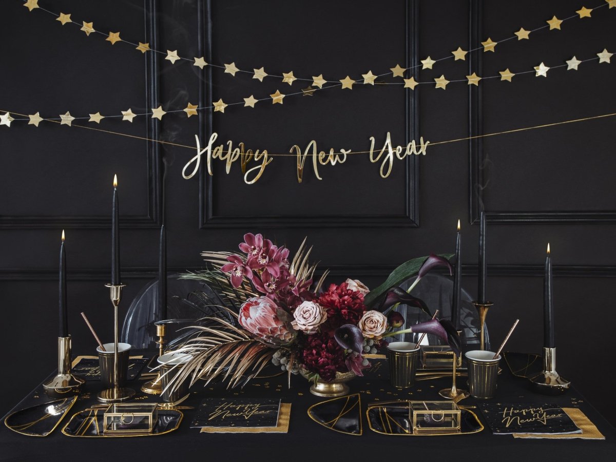 Indhold: syet banner Happy New Year lavet af spejlguldpapir, længde ca. 66cm, højde ca. 18cm.