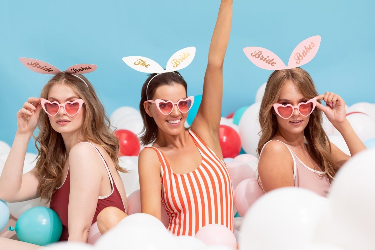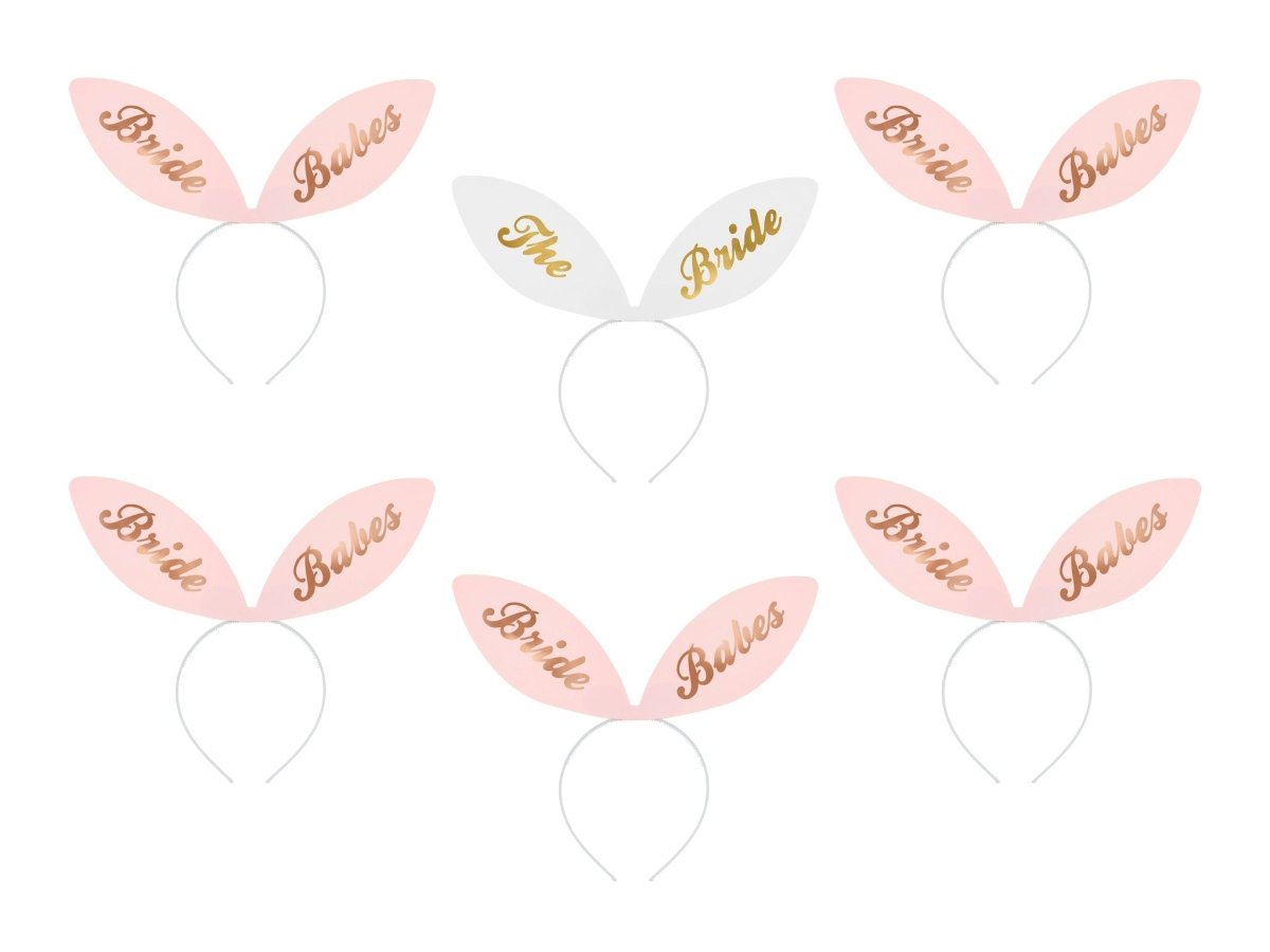 Sæt med 6 hårbånd med ører Bride Squad, 5 pink hårbånd med ordet "Bride Babes" og 1 hvidt hårbånd med ordet "The Bride". Størrelse ca. 29x25 cm