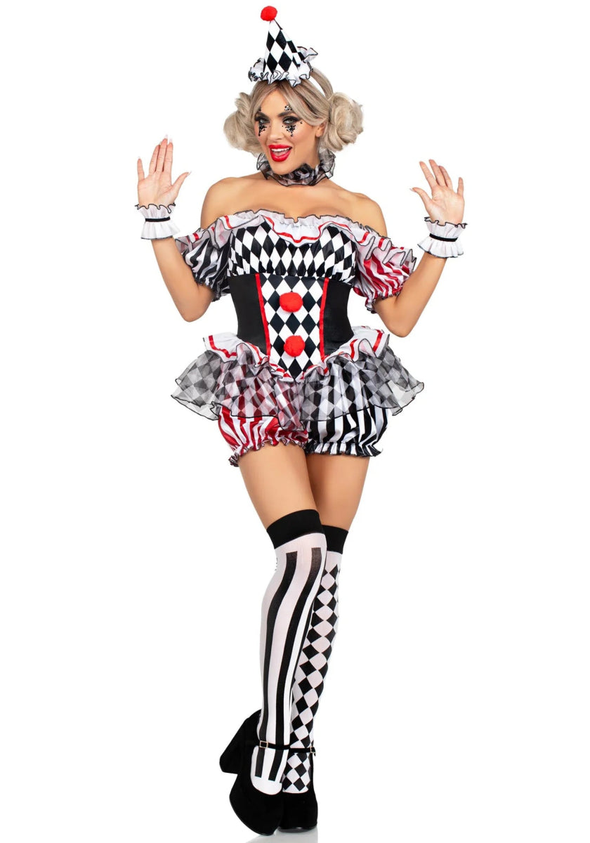 Bring cirkus til live med det 4-delte Darling Harlequin-kostume fra Leg Avenue! Dette flirtende og sjove kostume inkluderer en bloomer romper med flæser og pumps, flæser ved håndled og hals og et pandebånd med klovnehat. Dette charmerende halloween-look er perfekt til en cirkusinspireret temafest eller halloween-aften. Fuldend looket med tematiserede lårholdere og ansigtssmykker (sælges separat). 🎪💫