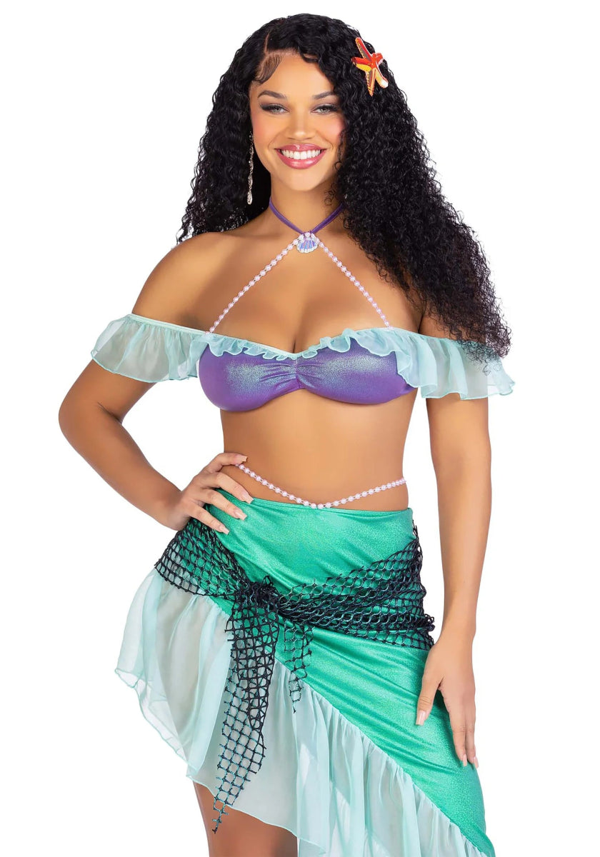 Forvandl dig til en fortryllende havfrue med Leg Avenues 3-delt havfruesæt ! Dette magiske sæt indeholder en perlehalter med iriserende bh-top med chiffonflæser, som giver dig et elegant havfrue-look. Den asymmetriske nederdel har en perlemorslinning og et iriserende netomslag, der skaber en fortryllende og magisk effekt, som vil transportere dig til havets dyb.