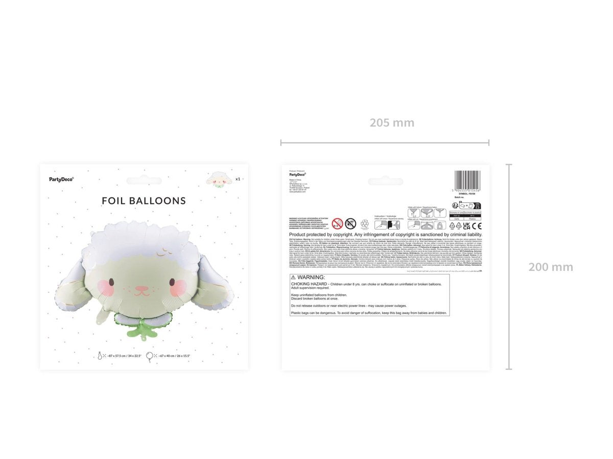 Folieballon Sheep, forskellige farver, mål før opblæsning ca. 87 x 57,5 cm (34 x 22,5''), mål efter opblæsning ca. 67 x 40 cm (26 x 15,5''). Kan pustes op med luft og helium. Sættet indeholder et sugerør.