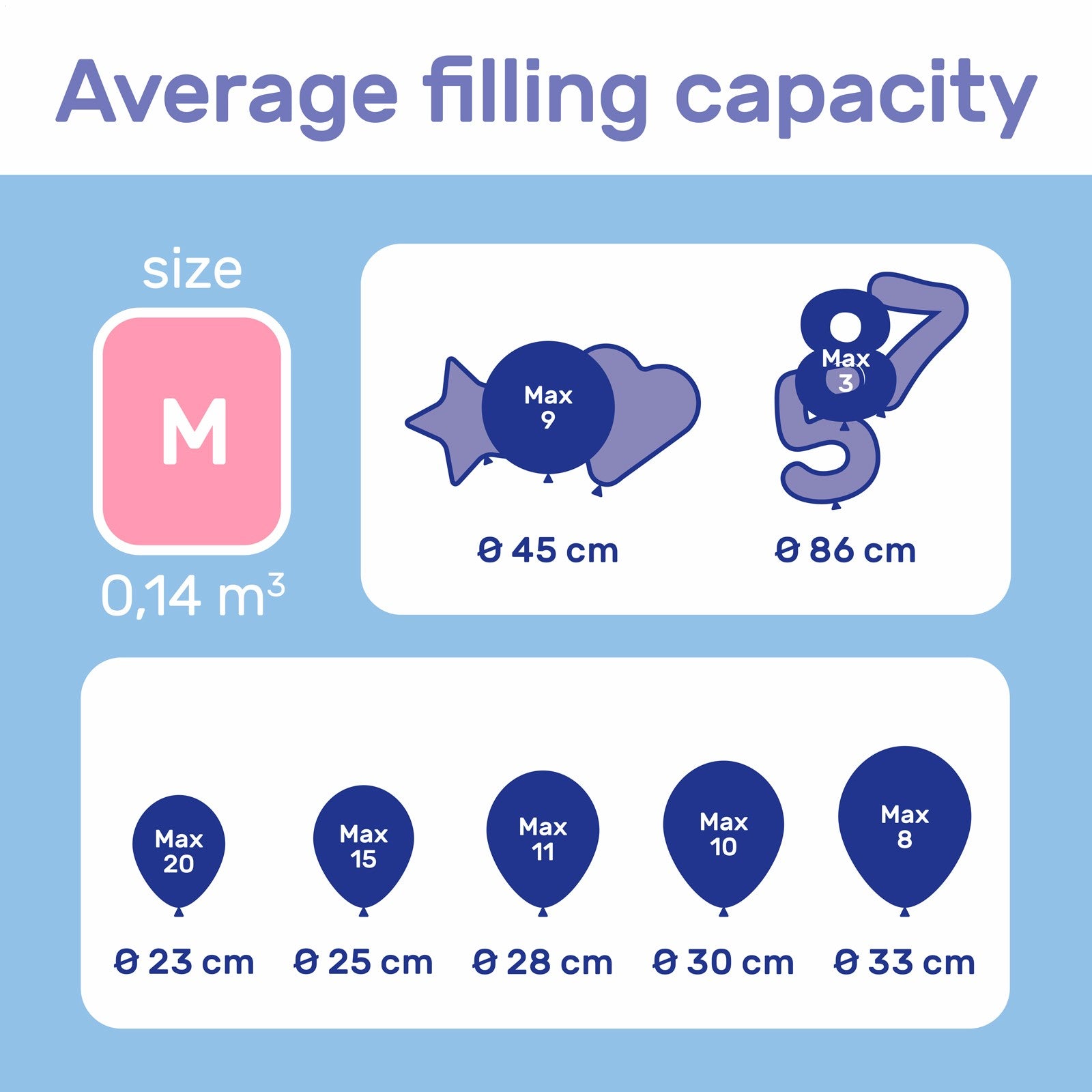 Hver centimeter en ballon er større, påvirker dens kapacitet. Heliumtankene er baseret på balloner på 25 cm, så hvis man f.eks. bruger balloner på 30 cm, kan man kun få halvt så meget ud af heliumtanken.