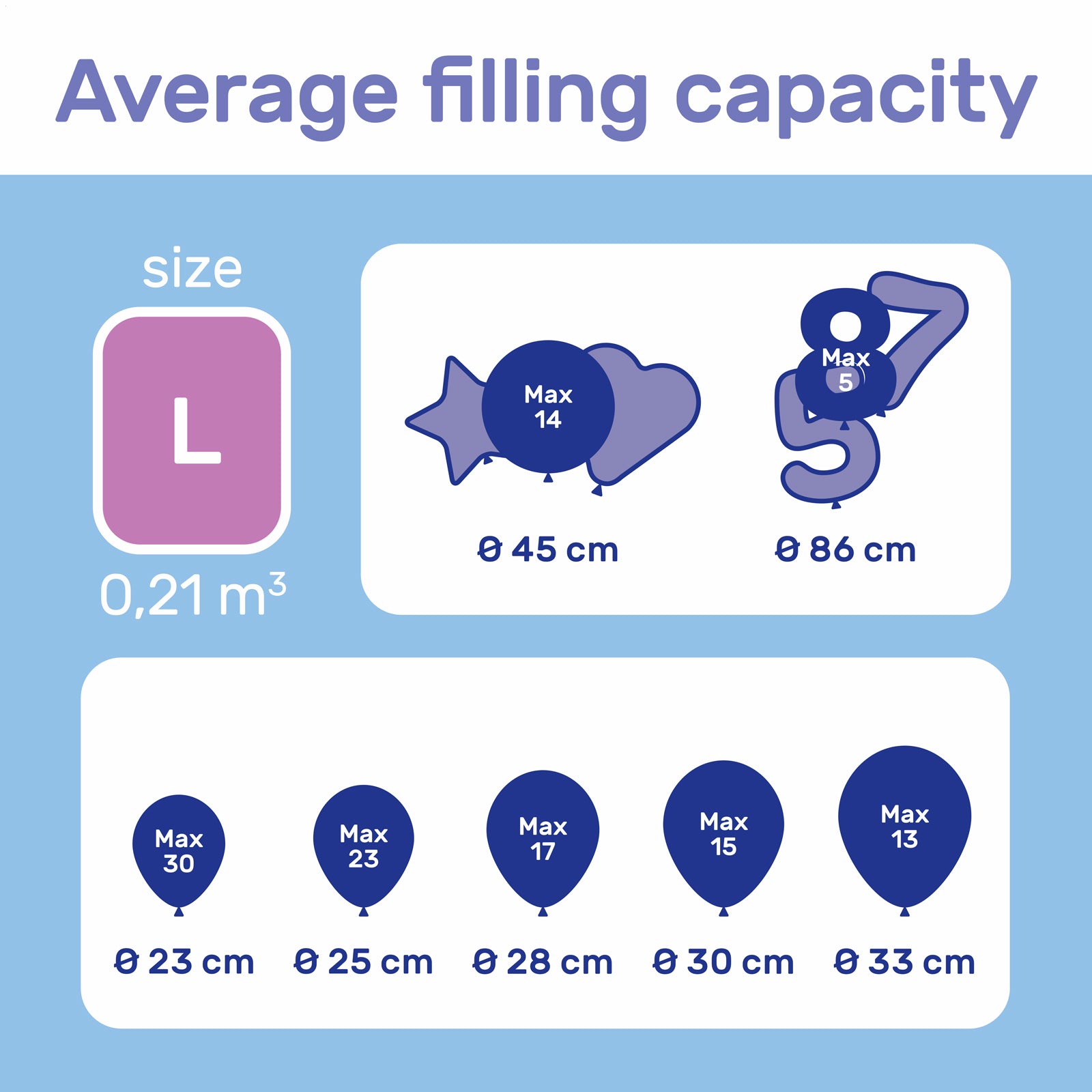 Hver centimeter en ballon er større, påvirker dens kapacitet. Heliumtankene er baseret på balloner på 25 cm, så hvis du f.eks. bruger balloner på 30 cm, kan du kun få halvt så meget ud af heliumtanken.