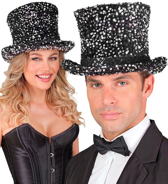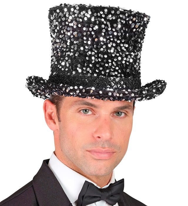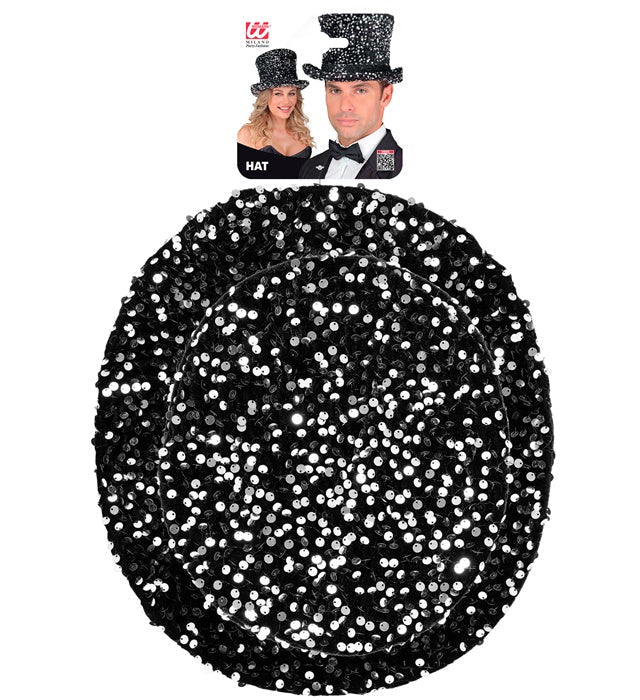 Gør et stilfuldt og festligt indtryk med denne høje hat med sorte og sølvfarvede pailletter. Perfekt til temafester, karneval, shows eller glamourøse begivenheder.