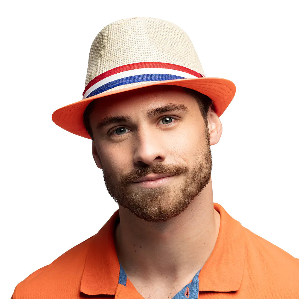 Denne søde Holland-stråhat giver et legende og festligt touch til et outfit til kongedagen, EM eller VM! Hattens bånd har det hollandske flag, og randen har en munter orange farve. En accessory, der viser hollandsk stolthed!
