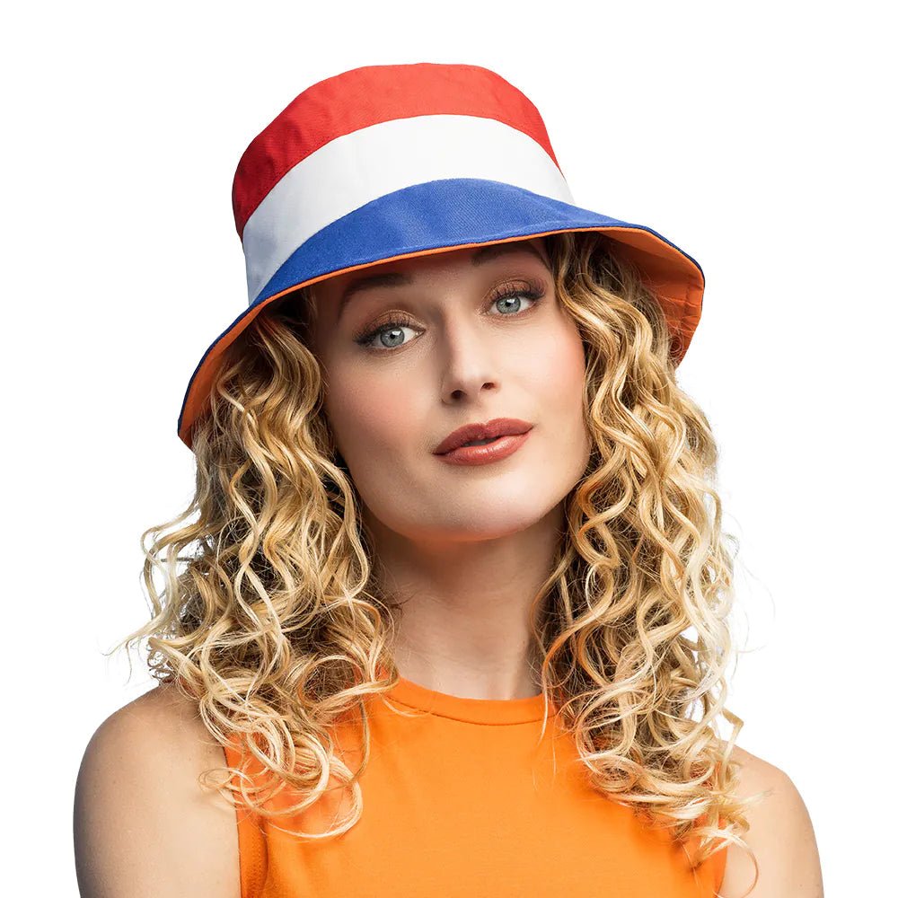 Bucket hat Holland er en stilfuld og praktisk hat i rød-hvid-blå, som lader dig fremstå helt i hollandsk ånd. Ideel til kongens dag, sportskonkurrencer og festivaler takket være den behagelige pasform og de lette materialer.
