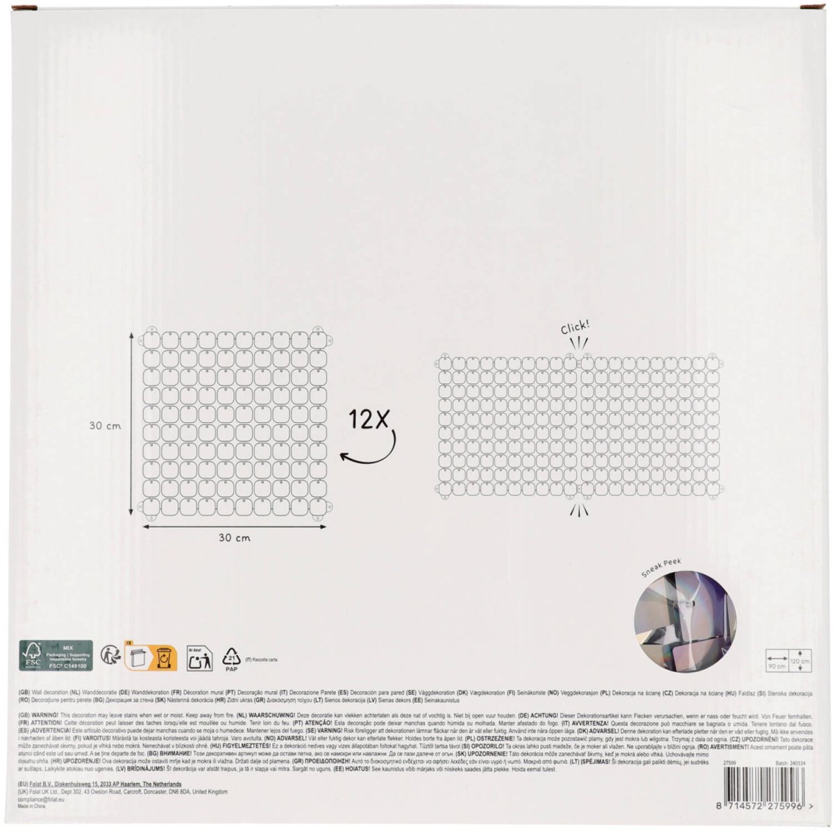 Et vildt statement! Baggrundspaneler - Iriserende - 30x 30 cm. Indhold: 12 backdrop-paneler. Kan f.eks. bruges til følgende fester/anledninger: Fødselsdag, temafest. Backdrop-paneler til iøjnefaldende kulisser og vægdekorationer, der vil blive husket. Panelerne klikkes nemt sammen. 1 panel er 30 x 30 cm. Denne vare er lavet af plast.