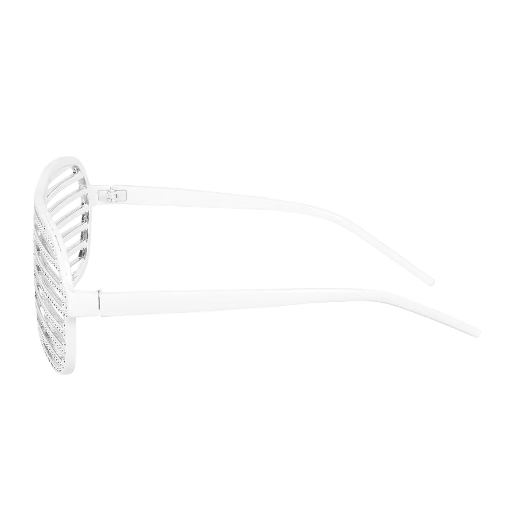 Disse seje shutter party-briller er perfekte til at tilføje lidt glamour til et sjovt retro 90'er-outfit til karneval, en mistake party eller en udklædningsfest. De hvide lamelbriller er dekoreret med glittersten. Meget flot til festivalgængere, festaber og 90'er-fanatikere.