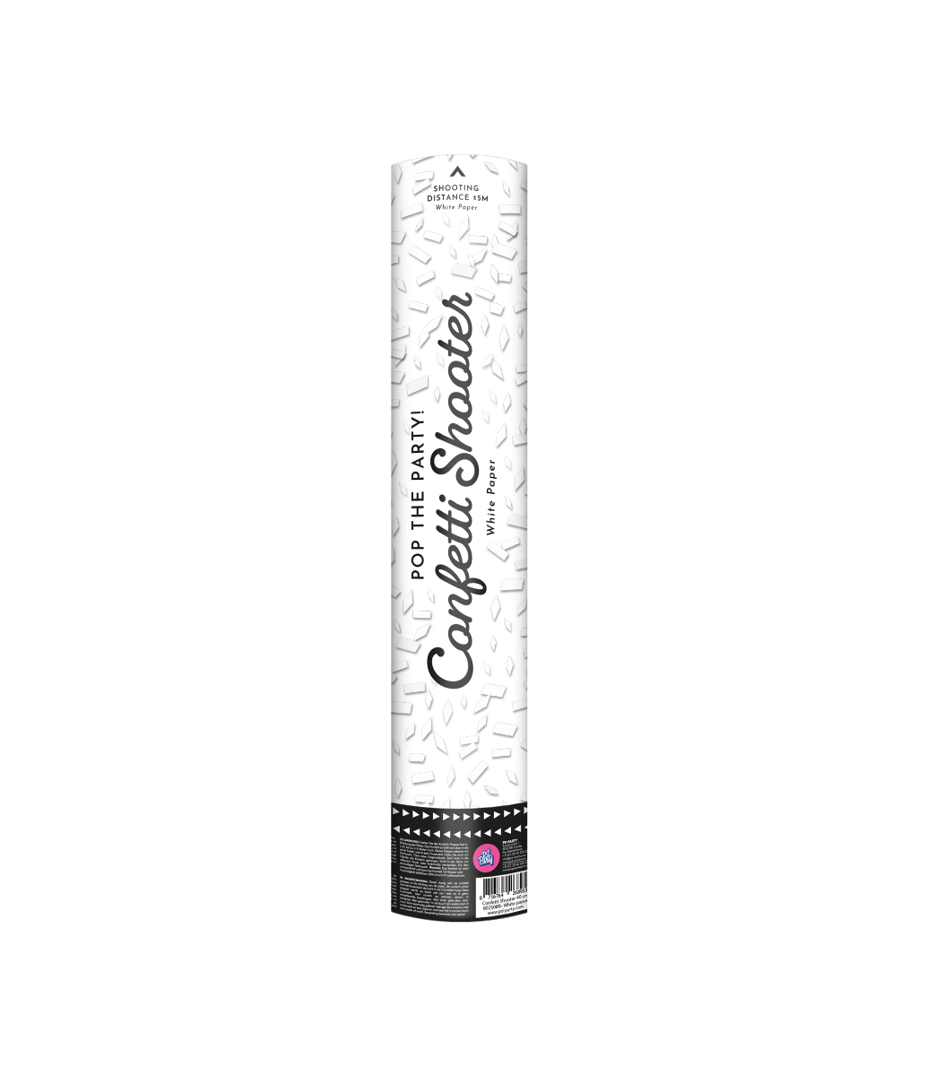 Bring liv i enhver fest med denne 40 cm konfettiskyder! Denne shooter skyder hvide papirstrimler op til 5 meter væk og skaber en øjeblikkelig festlig og spektakulær effekt. Perfekt til fødselsdage, bryllupper, jubilæer og andre festlige lejligheder.