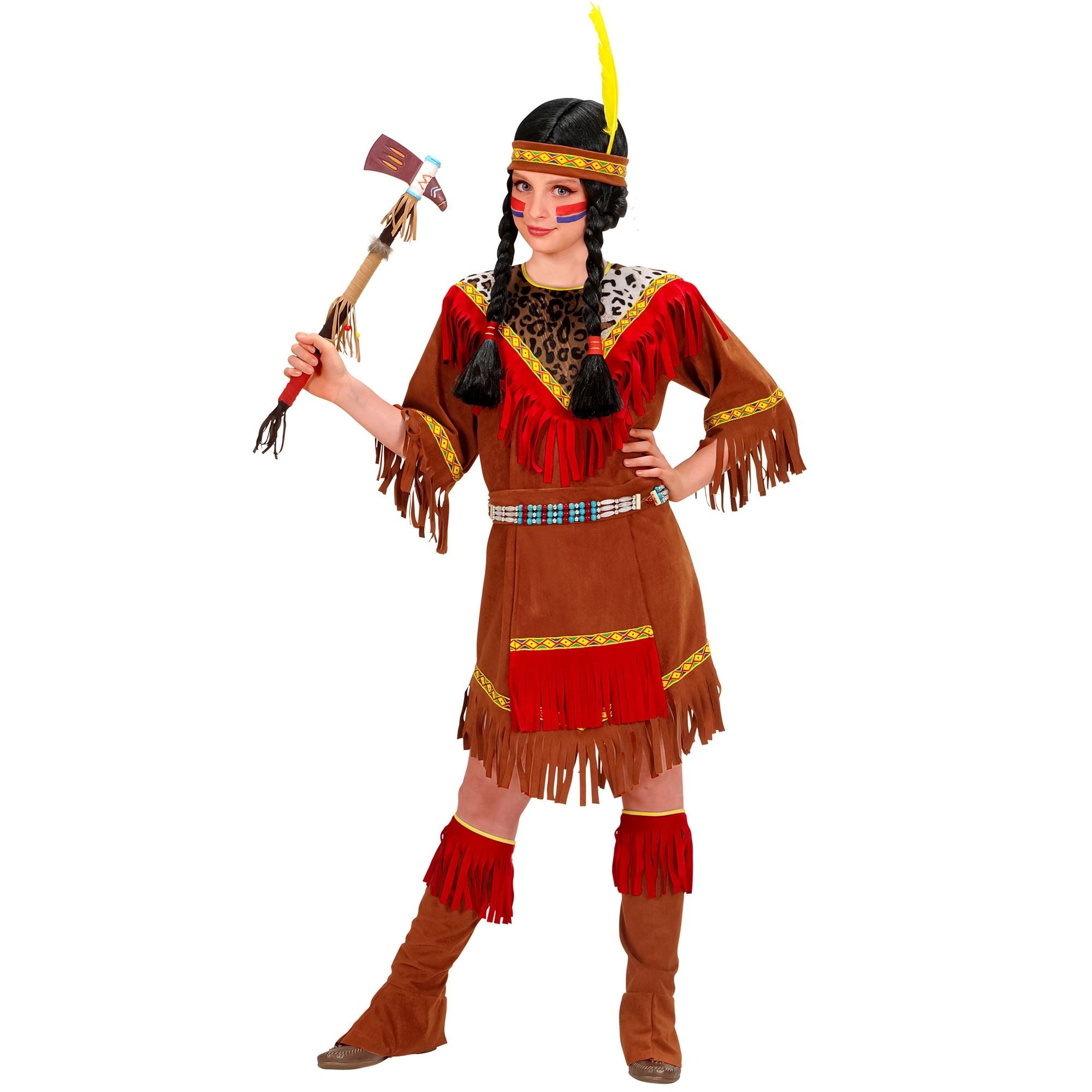 Beskrivelse: Indianerpigekjole, forklæde, støvlebeskyttere, pandebånd med fjer