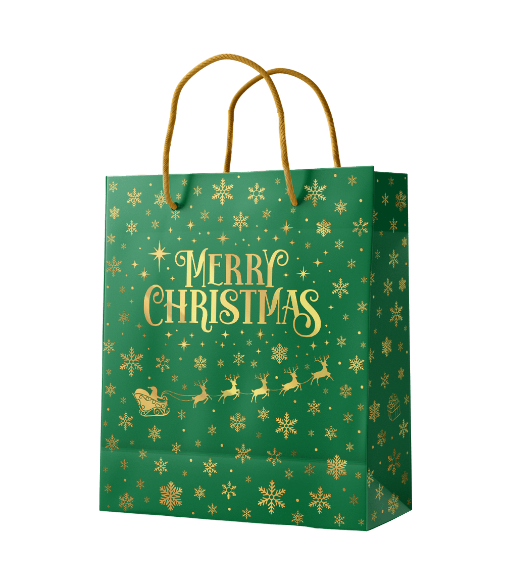 Giv dine julegaver et festligt præg med denne grønne gavepose Merry Christmasmed guldtryk og muntre julemotiver som rensdyr, snefnug og teksten Merry Christmas. Ideel til stilfuld indpakning af små gaver, godbidder eller overraskelser i juletiden