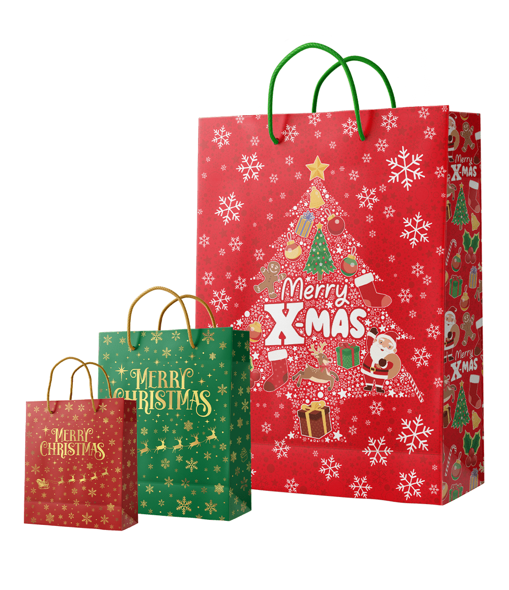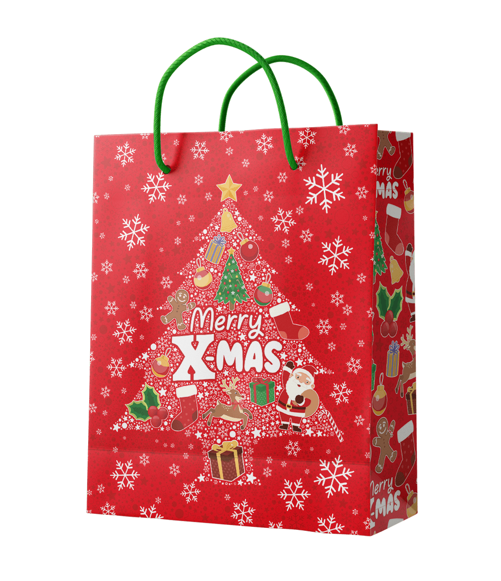 Pak dine julegaver stilfuldt ind med denne store gavepose i rød med festlige julemotiversom rensdyr, snefnug og teksten Merry Christmas. Det muntre design gør posen til et ægte blikfang under juletræet.