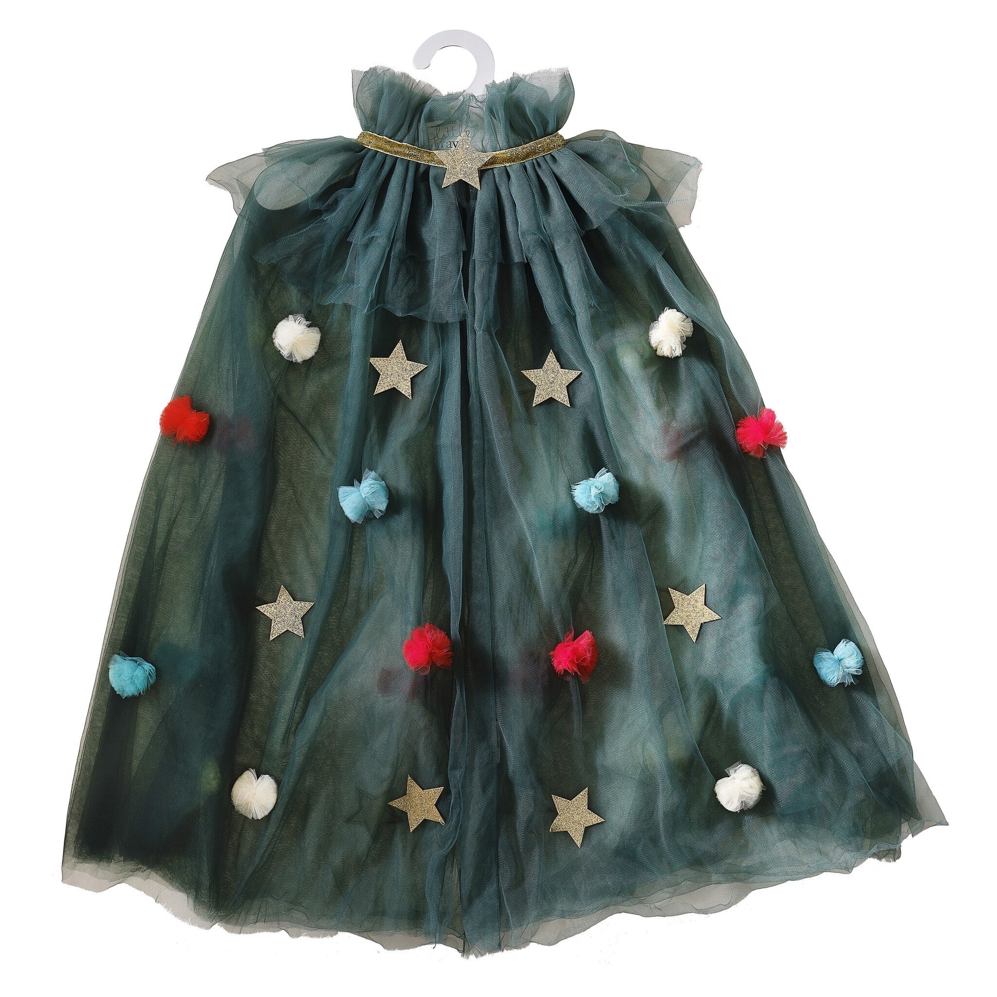 Denne smukke kappe er lavet af skovgrønt tyl med røde, blå og cremefarvede pomponudsmykninger af tyl og guldglitterstjerner.