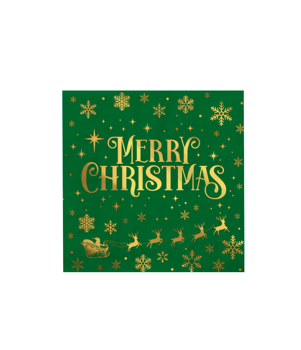 Fuldend dit julebord med disse grønne servietter med Merry Christmas-detaljer i guld. De festlige farver og stilfulde motiver skaber øjeblikkeligt et varmt og hyggeligt look i højtiden.