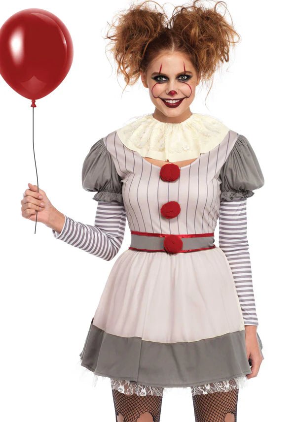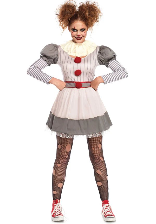 Vis din uhyggelige side i det 2-delte Creepy Clown-kostume fra Leg Avenue! Dette kostume indeholder en stribet kjole med pom-pom-detaljer og en blondehalsdel, som giver dig den perfekte blanding af sød og uhyggelig. Denne udklædning er perfekt til halloween eller andre skræmmende temafester og vil med garanti gøre dig til festens stjerne! 🎪👻