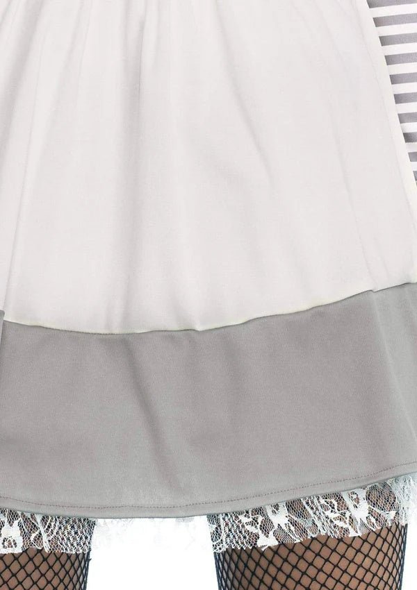 🔹 Stribet kjole og pom-pom-detaljer giver et legende touch, mens blondehalsen skaber en uhyggelig stemning