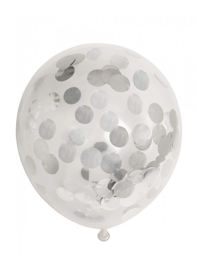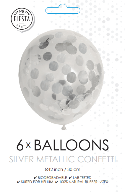 Emballageindhold:Konfettiballoner Sølv 30cm 6stk