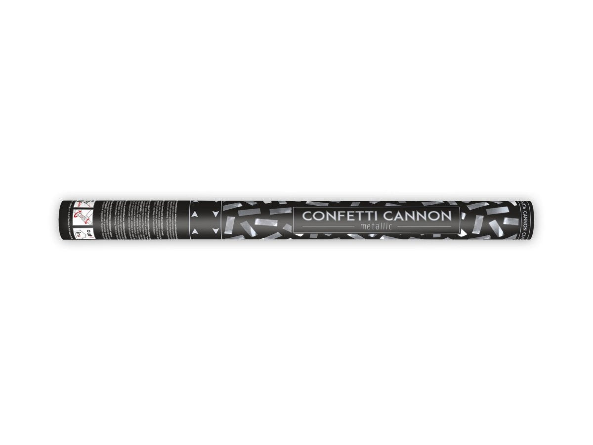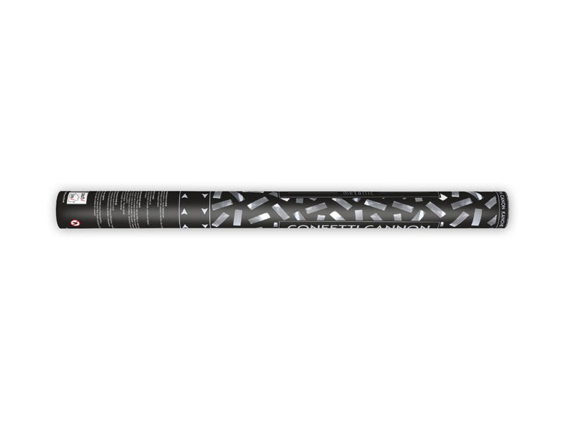 Indhold: Konfettikanon, der skyder ud af metalkonfetti, sølv, længde 60 cm.