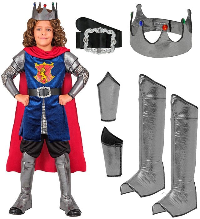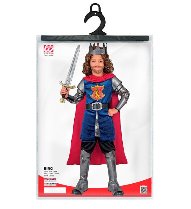 Bliv festens konge med dette kongekostume i blåt og rødt. Sættet indeholder en frakke med matchende kappe, bælte, manchetter, krone og over-the-top støvler for at fuldende dit look fra top til tå. Perfekt til temafester, udklædningsfester eller sceneoptræden. Pakken indeholder 1 kongekostume inklusive jakke med kappe, bælte, manchetter, krone og over-the-top-støvler.