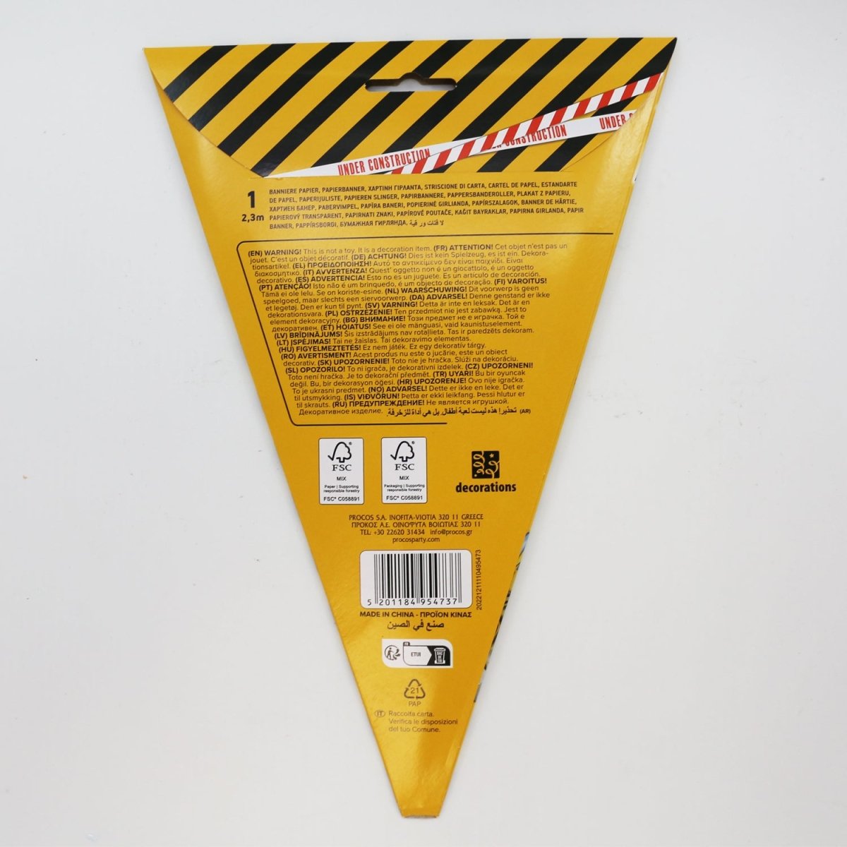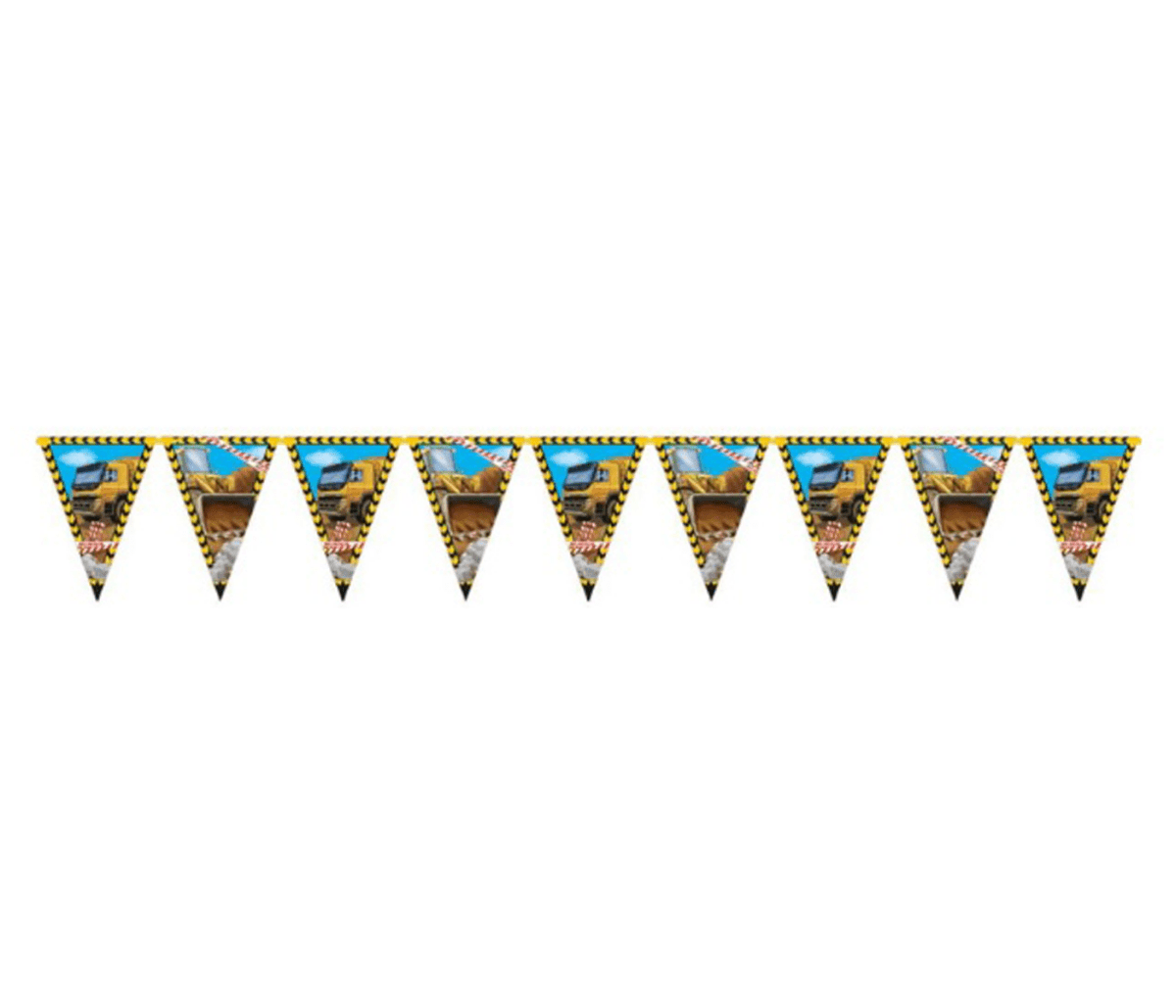 Denne flagline med byggeplads-tema er perfekt til at forvandle en fest til en rigtig byggeplads. De muntre entreprenørmaskiner og klare farver gør guirlanden ideel til børnefødselsdage og temafester. Med en længde på 2,3 meter og 9 robuste papirflag er dette en iøjnefaldende, men alligevel stemningsfuld dekoration.