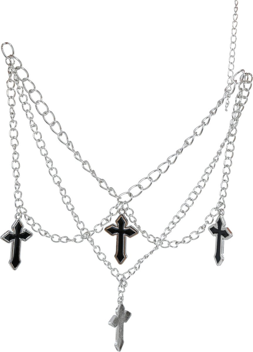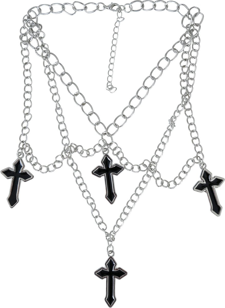Halskæden med fire kors er lavet af holdbart metal og har en skinnende sølvfinish. Korsvedhængenes subtile, men markante design gør dette smykke velegnet til både hverdagsbrug og særlige lejligheder. Brug det som et modestatement eller som et symbol med personlig betydning.
