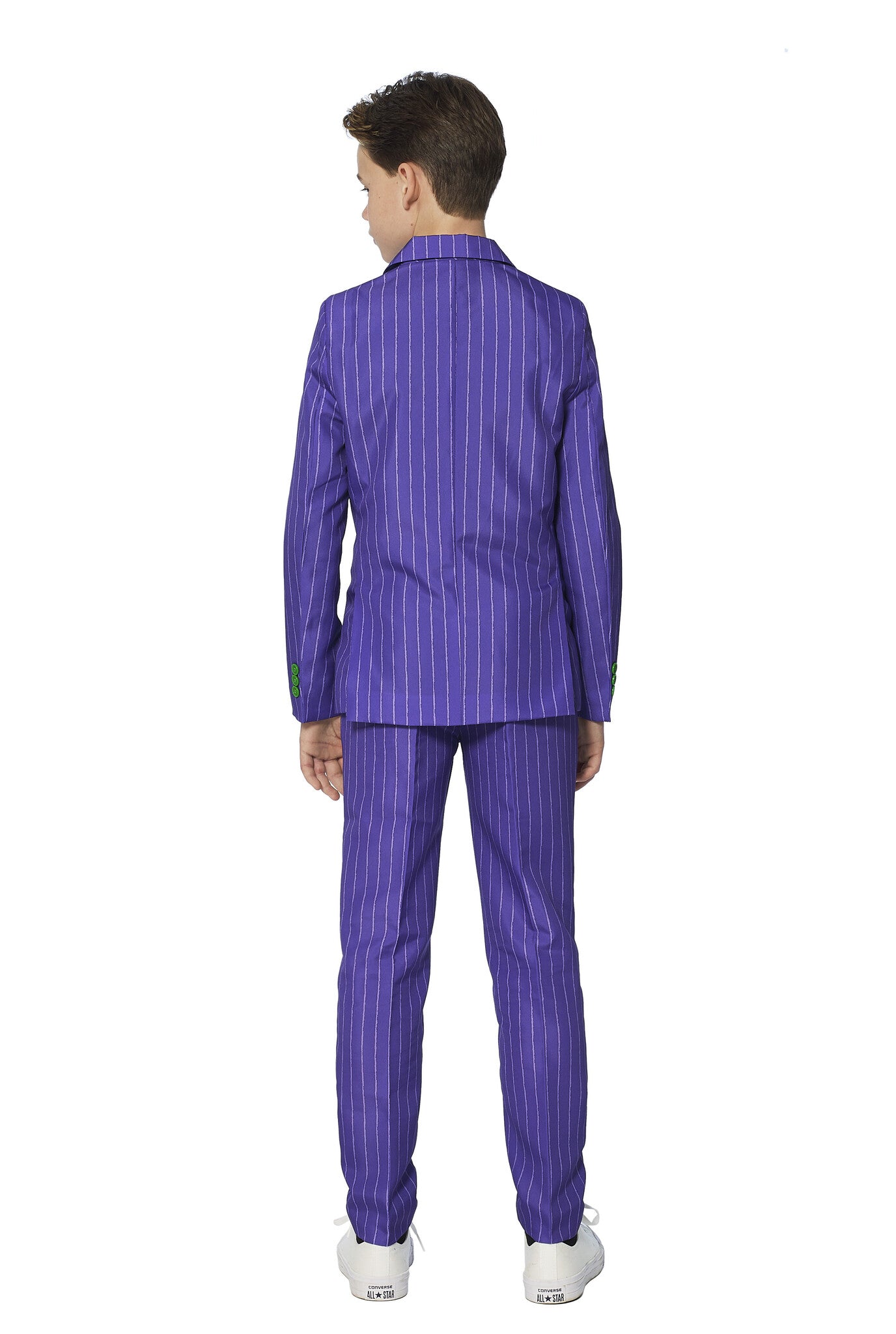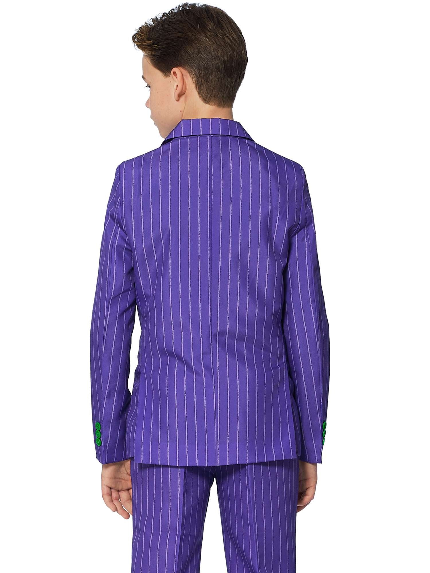 Uanset om din lille dreng kender Jokeren™ fra en film, en tegneserie eller et videospil, er én ting sikker: Du vil få din lille dreng til at grine som skurken med denne officielle Jokeren™-dragt. Det er fantastisk til mange lejligheder, inklusive udklædningsfester og halloween. Sættet består af en jakke, bukser og et sikkert slips, der kan klikkes på. Bukserne har en justerbar linning, som giver en behagelig og stilfuld pasform.
