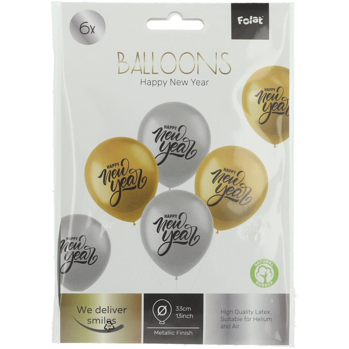 Balloner Godt Nytår 33cm - 6 stk. Indhold: 6 latexballoner. Farver: guldfarvet og sølvfarvet. Kan f.eks. bruges til følgende fester/anledninger: Gammelt & Nyt. Hver ballon måler 13 tommer/33 cm. Varen er fremstillet af latex.