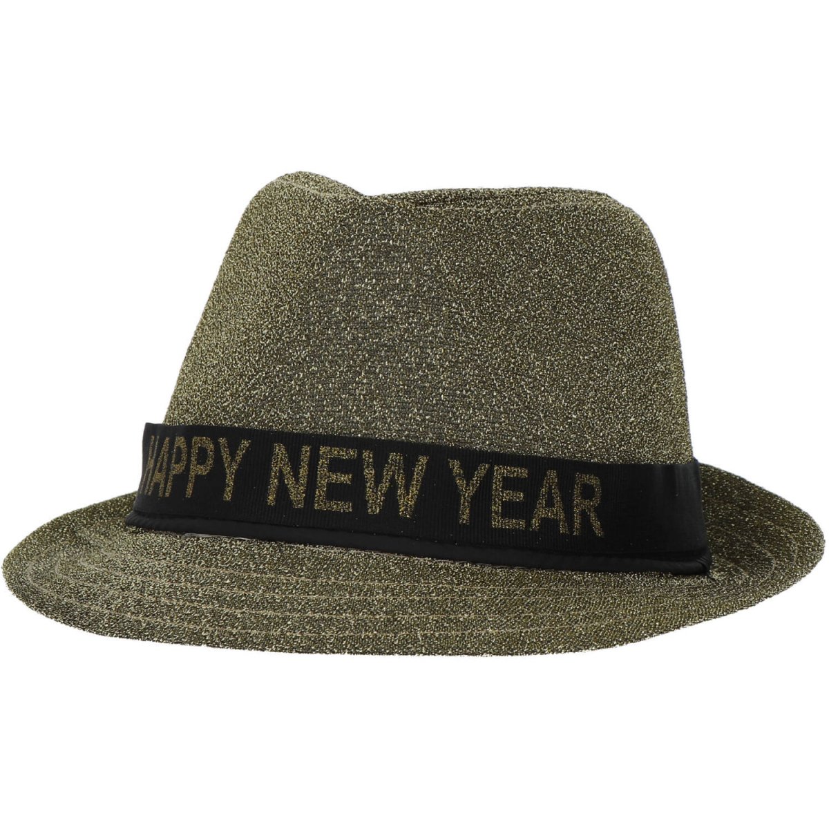 Trilby Hat 'Happy New Year' Lurex Gold. Indhold: 1 hat. Farve: Guldfarvet. Kan f.eks. bruges til følgende fester/anledninger: Gammelt & nytår og temafester. Hattens størrelse: 59 cm. Hatten har et aftageligt bånd med teksten "Happy New Year". Fjern båndet, og brug hatten til andre temafester. Varen er lavet af polyester.