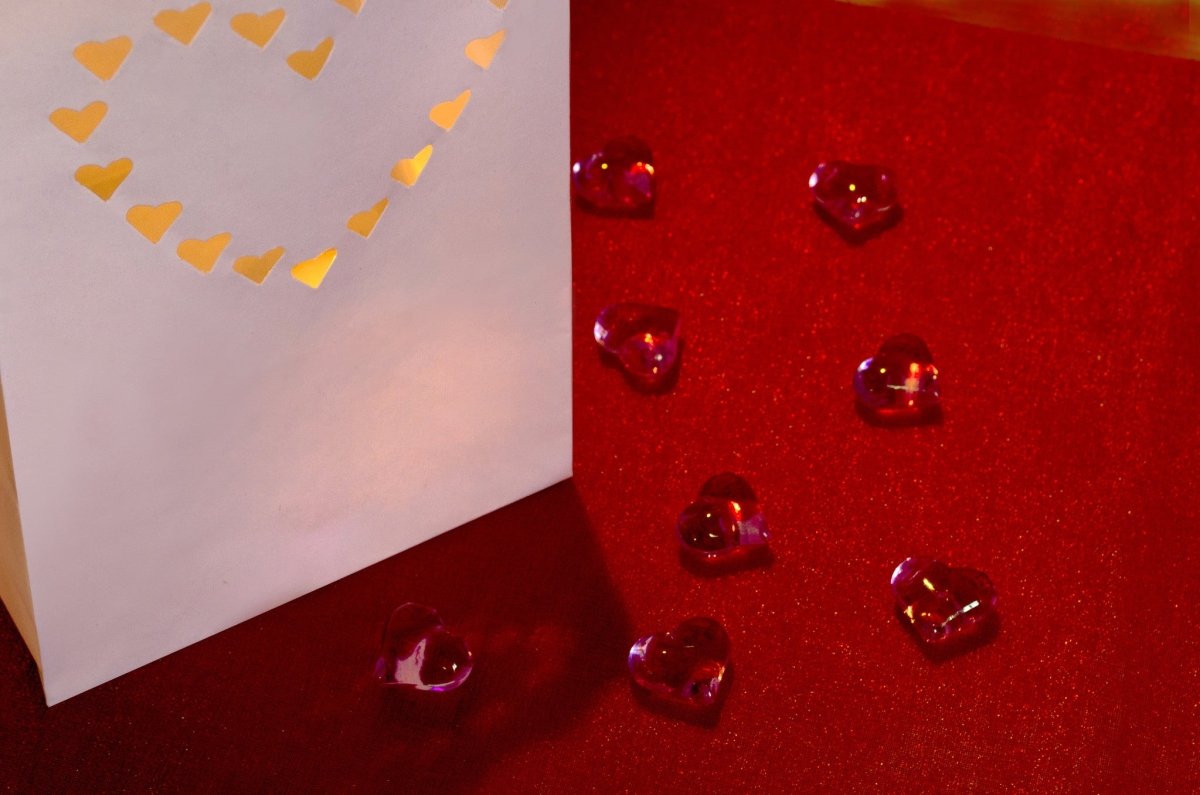 Indhold: Stearinlysposer, i form af poser, hvide, med hjertemotiv, størrelse 15x9x26 centimeter. Fremstillet af ikke-brændbart papir.(1 pkt/10 pct.)