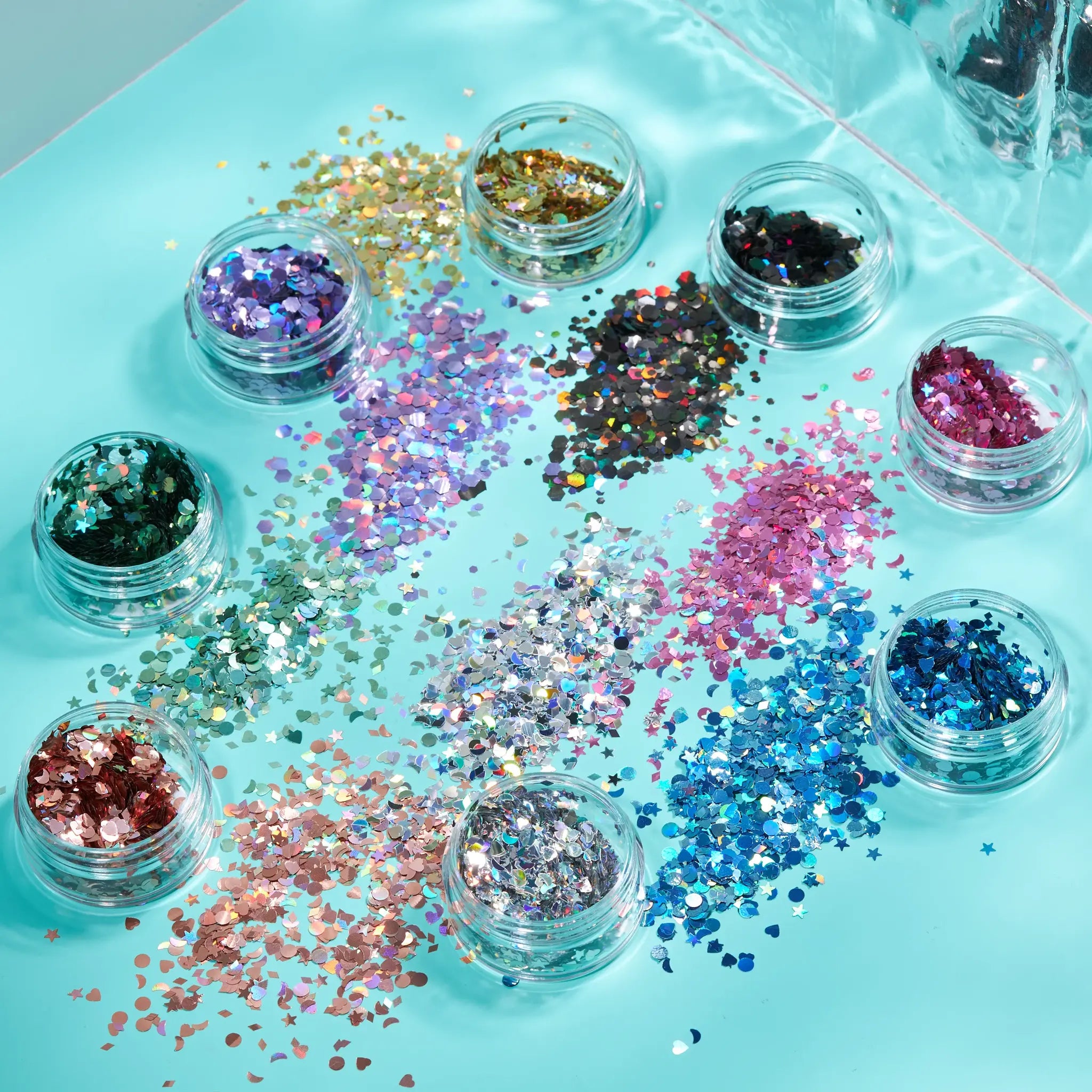 Føj en ekstra dimension til med vores holografiske glitterformer. Stjerner, prikker, hjerter, halvmåner og diamanter. Vores glitter er af kosmetisk kvalitet, så det er helt sikkert at påføre i ansigtet, i håret og på kroppen, og det kan nemt fjernes med almindeligt vand.