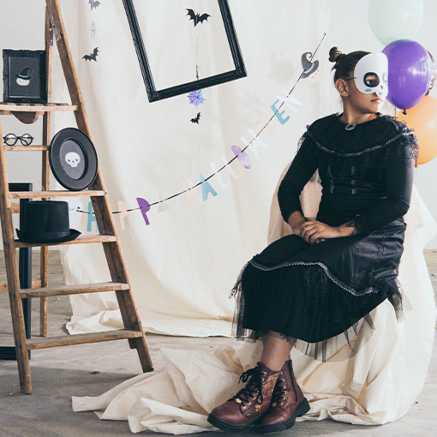 Fuldend dit halloween-outfit med denne uhyggelige Happy Halloween-skeletmaske. Et enkelt, men iøjnefaldende tilbehør til et uhyggeligt look under halloween.