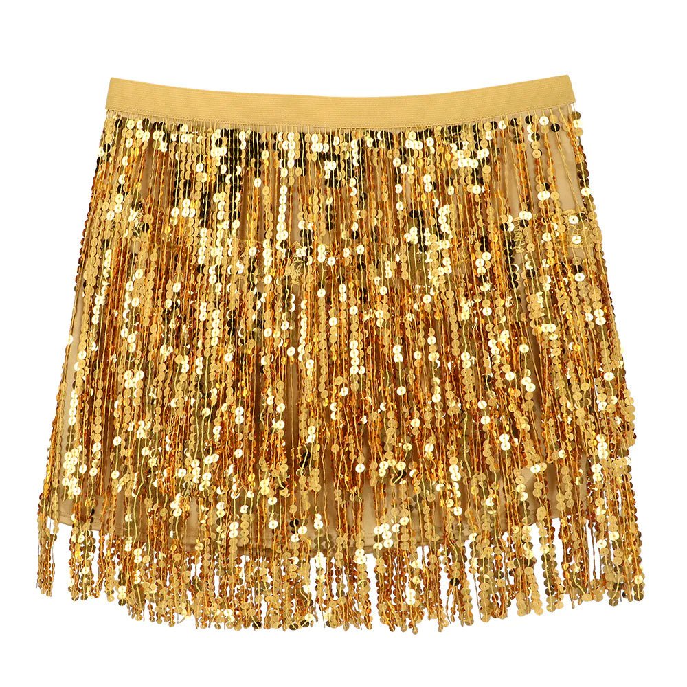 Lad dig selv skinne med dette funklende miniskørt i guld! Nederdelen er dekoreret med glitrende pailletter og legende frynser og bevæger sig med hvert skridt for en uimodståelig effekt. Perfekt til fester, karneval eller udklædningsfester.