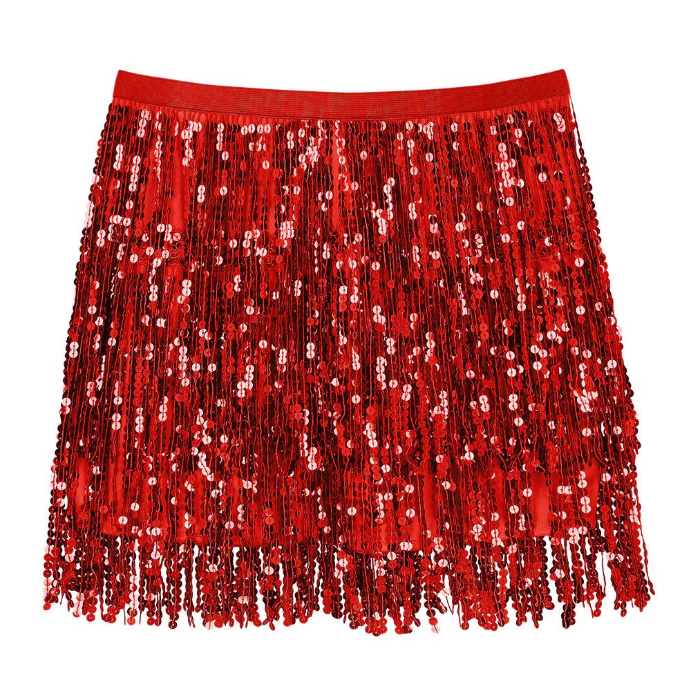 Lad dig selv skinne med denne funklende røde mini-nederdel! Nederdelen er dekoreret med glitrende pailletter og legende frynser og bevæger sig med hvert skridt for en uimodståelig effekt. Perfekt til fester, karneval eller udklædningsfester.
