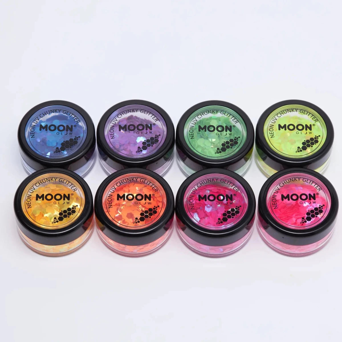 Moon Glow Intense Neon UV Chunky Glitters er et must-have til at skabe markante looks, der skinner neonfarvet om dagen og gløder om natten under UV-lys eller blacklights. Uanset hvor du er - deres stjernekvalitet stjæler showet!