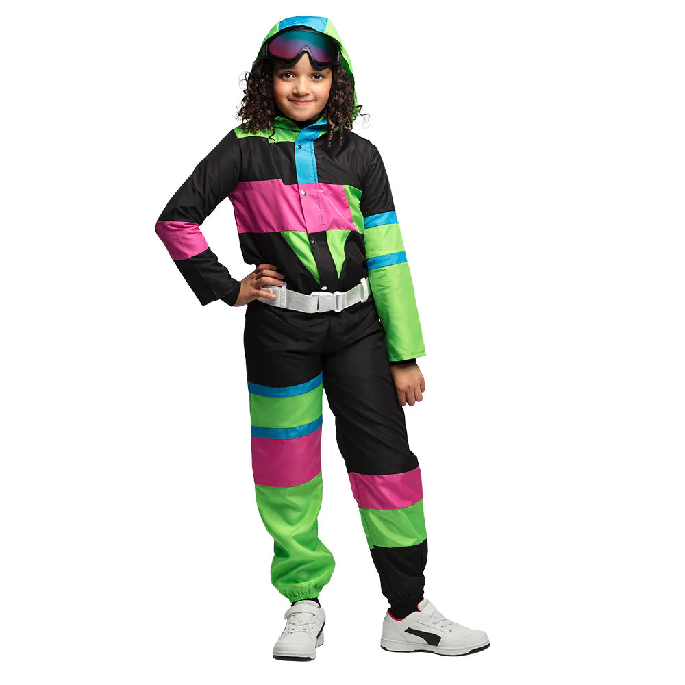 Gå tilbage i tiden med denne sjove retro-skidragt, der er inspireret af 80'ernes og 90'ernes farverige og dristige stil. Fås også i en dame- og herreversion, så fest med stil med hele familien. Kostumet indeholder en jumpsuit, bælte og skibriller.
