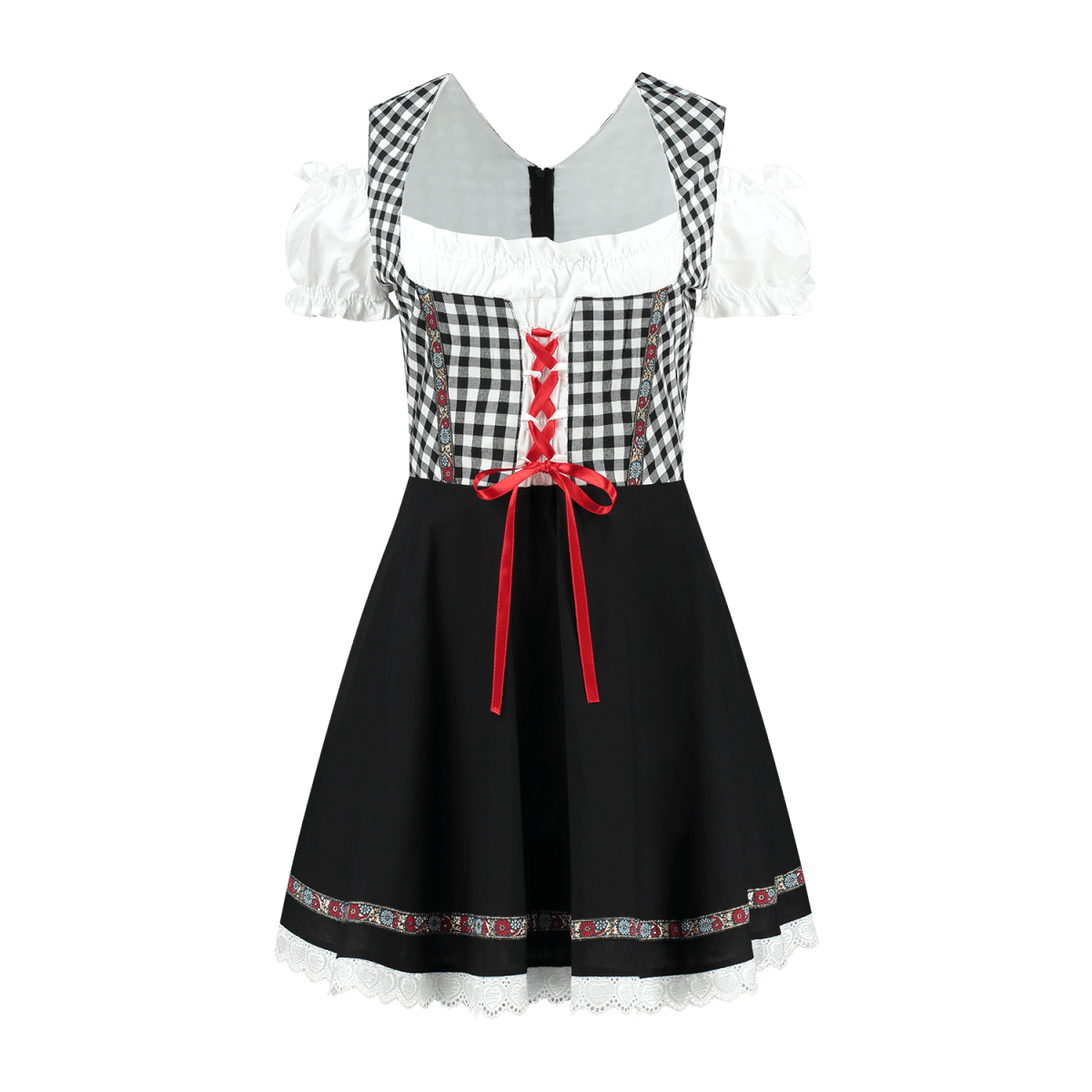 Dirndlkjole med ensfarvet bluse, elastisk halsudskæring og sort/hvid ternet overdel. Overdelen er fremstillet af 55% bomuld og 45% polyester. Blusen og nederdelen er fremstillet af 100% bomuld. Fuldt foret. Med smukke bånd på brystet og nederdelen. Nederdelen er pyntet med de fineste blonder. Nederdelens længde er ca. 45 cm. Lynlåsene er lavet af YKK-lynlåse. I dirndlen er der en stiklomme. Fås i størrelserne 34 til 46.